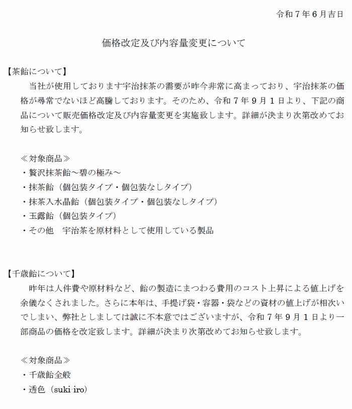 | 茶飴・千歳飴の価格改定及び内容量変更について |