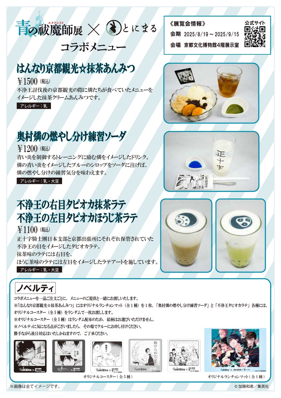 「青の祓魔師展」京都会場の開催を記念し、展覧会開催期間中、とにまるぶんぱく店にて、 展覧会とコラボレーションしたメニューの販売が決定しました! 『青の祓魔師』をイメージしたドリンクとスイーツをご用意してお待ちしております。 ●実施期間 2025年8月19日(火)~9月15日(月・祝)※休館日を除く ●営業時間 11:00~18:00(ラストオーダー 17:30) ●店内利用時間制限 ご着席されてから1時間※コラボメニューのテイクアウトはございません ●事前予約 無しでご利用いただけます。またご予約も承っておりません。 ●整理券配布の有無 混雑時は整理券を配付 ※整理券の配布開始・終了告知時はとにまる(@kyoame_tonimaru)のXでお知らせいたします ●店内利用注意事項 ・状況により、営業時間が変更となる場合がございます。 ・カフェの混雑状況により、ご案内目安のお時間より、お待ちいただく場合がございます。 ・整理券1枚につき、1グループ様とさせていただきます。(1グループ上限4名様まで) ・整理券の数には限りがあり、なくなり次第配布終了とさせていただきます。 ・入店方法は変更になる場合がございます。 ・他のお客様もいらっしゃいますので、過度な写真撮影、迷惑行為等があった場合、お声がけさせていただきます。 ・なるべくテーブルごとでまとめてお会計をお願いします。 ●ノベルティについて コラボメニューを一品ご注文ごとに、ノベルティとしてドリンクにはオリジナルコースター(全5種)をランダムで1枚、 フードにはランチョンマット(全1種)を1枚、メニューのご提供と一緒にお渡しいたします。 ※ノベルティの絵柄はお選びいただけません。 ※ノベルティに気になる点がございましたら、その場でクルーにお申し付けください。 勝手ながら後日対応はいたしかねますので、ご了承ください。