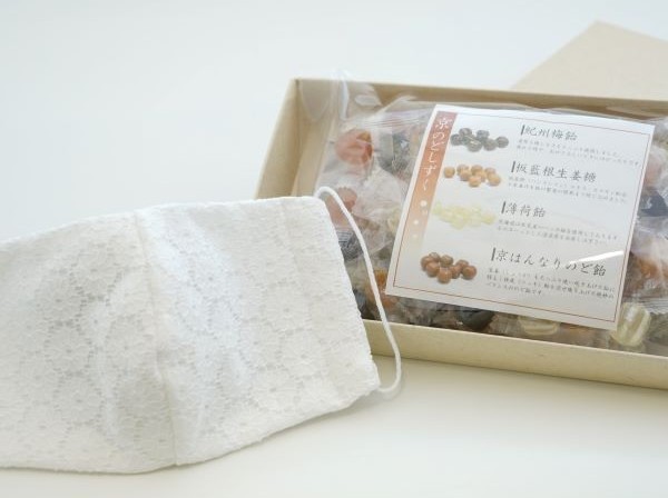 のど飴(紀州梅飴、生姜飴、京はんなりのど飴、ハッカ飴)と柄が選べるマスクのセット。