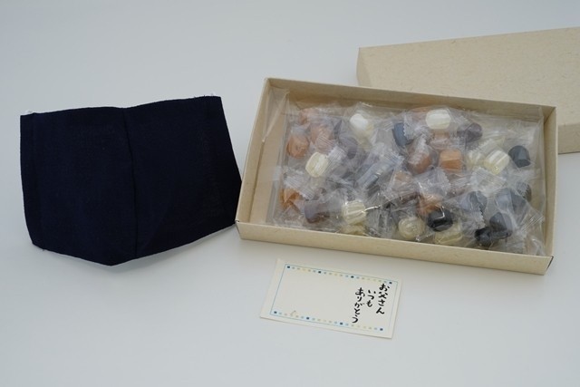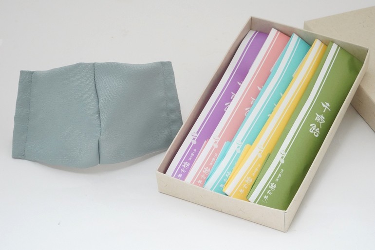 5色の千歳飴とマスクのセット。マスクは子供用と大人用から選択できます。