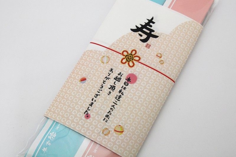 紅白のおめでたい千歳飴のプチギフトです。 青とピンクののしに包まれており、夫婦が寄り添う姿をイメージしました。 また、メッセージは2種類ご用意しております。