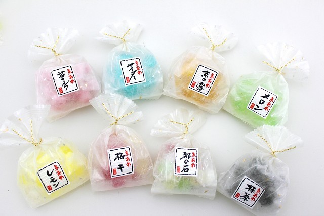 お客様の声より誕生した商品です。キラキラした上品な袋を使用し、おめでたい席にぴったりです。 苺ミルク、レモン、サイダー、メロン、京の露(べっこう飴)、都の石、梅干、抹茶の8種類からお選び頂けます。 ウエディング・二次会向け以外にも敬老の日、母の日、快気祝いなど記念日にもぴったり。