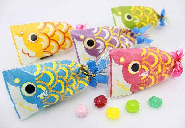 ポップでカラフルな鯉のぼりキャンディは、青(サイダー)・赤(苺ミルク)・黄(レモン)・緑(メロン)・紫(ブルーベリー)の5種類。お子様に人気のフルーツ系の味。 手のひらサイズの大きさです。リボン付で華やかに仕上げました。